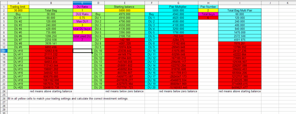 You will now have two sets of calculations, the first set is based on a single pair (green) and the second set is for multiple pairs with the same DU and Trading Limit settings (red).